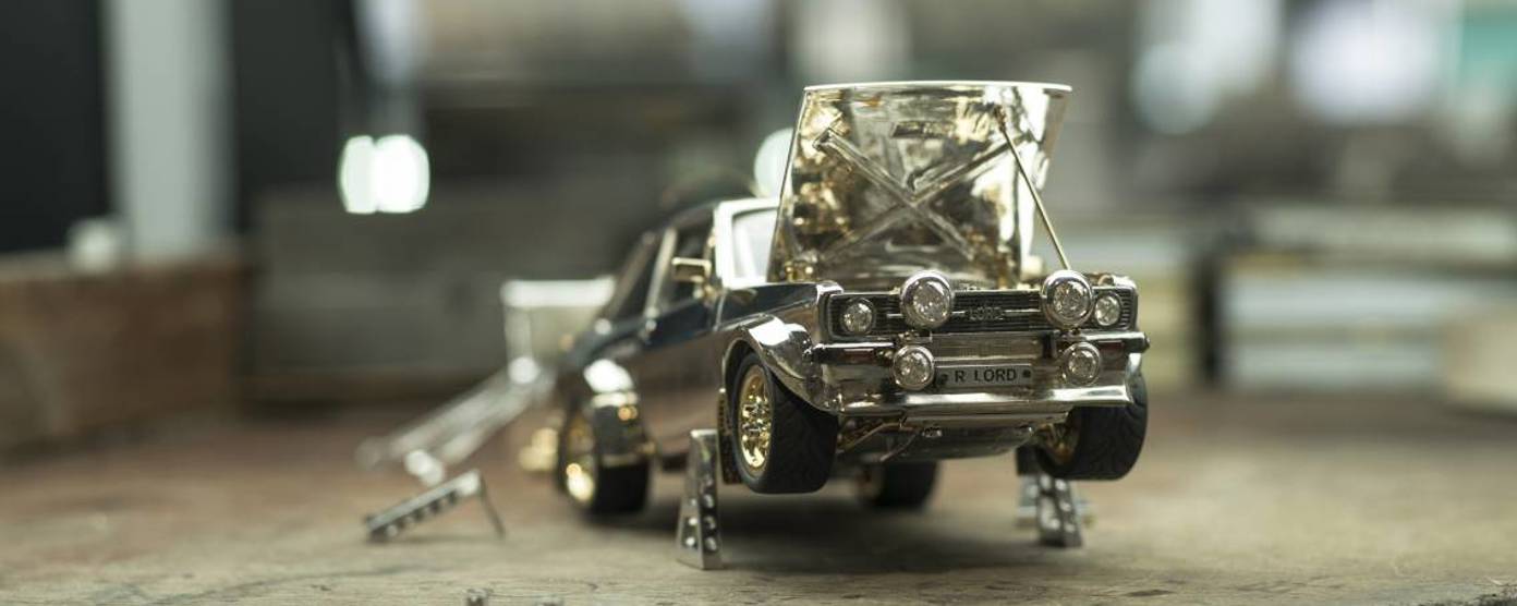 This vehicle, the Lord Ford Escort, has been built by Russell Lord and entwines his 45 years of experience as a rally driver, enthusiast and diamond mounter into one unified project. The result of which was inspired by Russell’s son, Rob, who unearthed the remains of his father’s project (which originally amassed 25 years of work prior), three years ago. The model Ford Escort RS1800 was built as a replica of Ari Vatanen’s campaign vehicle in the 70’s.